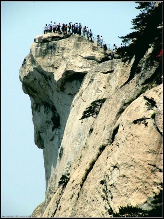 险八脚 指石龟颈部到头顶的一段路程。从天梭石至石龟顶部,其间岩石上翘。形如屋脊,宽不过尺,两侧崖壁如削,深达百丈。人们欲登龟头,必经此处,如有不慎失足,绝无生还的可能,故称险八脚。现已装防护铁链,可保安全,但恐高者还是胆战心惊。