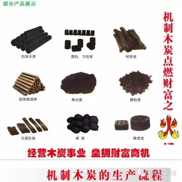 工艺流程:将原料粉碎成10mm的颗粒状,烘干或晾晒后使之含水量小于12%,进入制棒机,经过高温高压使之成棒形(不添加任何添加剂),然后放入炭化炉中进行炭化,制成机制木炭。