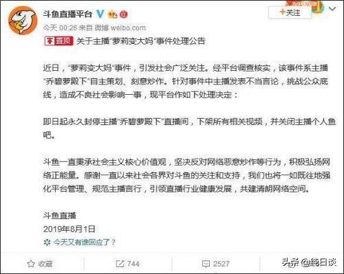 斗鱼平台随即发布消息,乔碧萝殿下的这场闹剧纯属炒作,于是永久封其账号,以正风气。