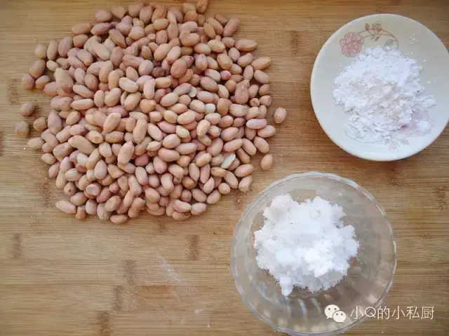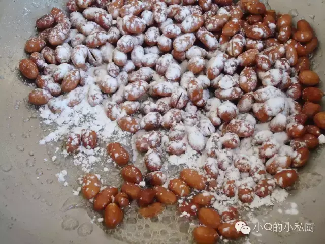 放入之前炒好的花生 然后撒入淀粉 快速翻炒让糖浆均匀地裹在花生上 然后关火 继续翻炒 直到锅内温度降下来 糖浆完全凝固 就可以了