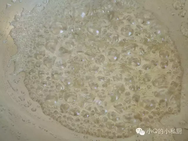 等锅内的糖浆由大泡变成小泡 颜色微微泛黄 用铲子挑起糖浆 应该是形成一条线快速下落 这时候糖就熬好了