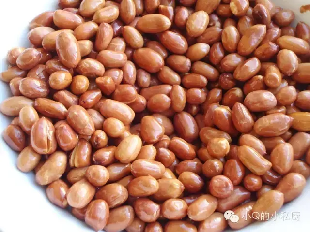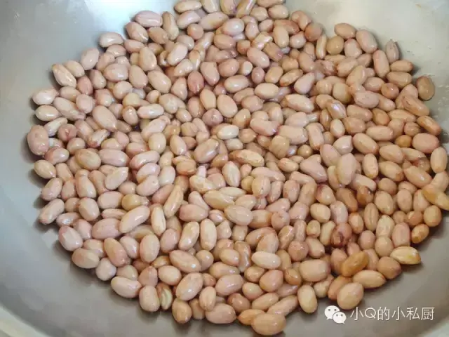 锅内放入花生油 倒入花生再打开火 用中火炒花生