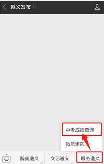 3.在公众号内右下角菜单“服务遵义”中选择“中考成绩查询”。