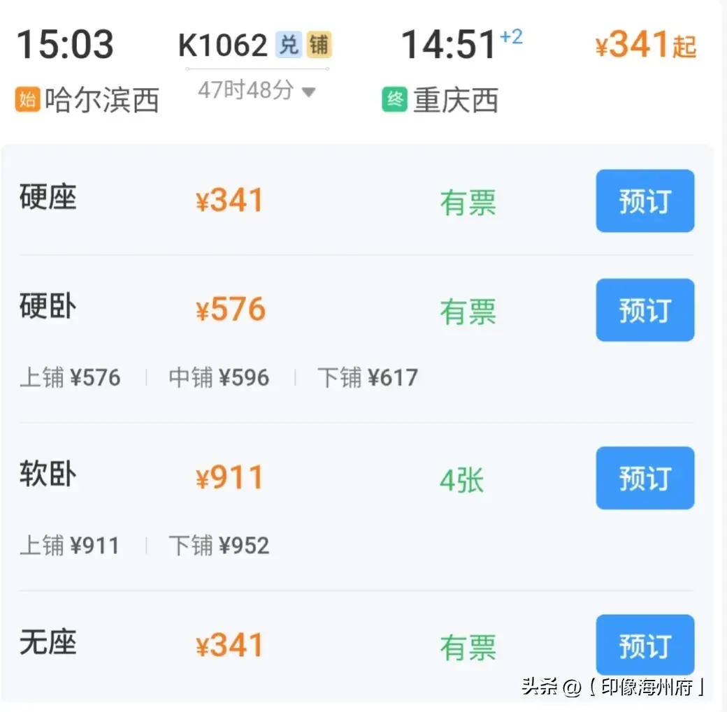 需要特别说明的一点是,尽管哈尔滨到重庆,其间远隔万水千山,路途遥远,但是,K1062/1063次快速旅客列车的票价,还是非常实惠的。