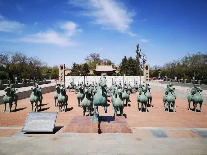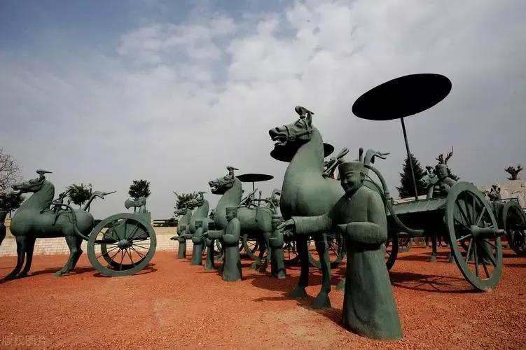墓的前室和它的耳室,置放有一组造型优美、技艺精湛的铜车马和铜俑。铜车共14辆,其中包车大车步使年邾车的制作十分精致,车的双辕前部成曲形,驾车时便于车舆平衡;车與的前部有遮蔽,用以掩护乘车者的下半身躯;车上有圆形华盖,用以遮阳挡雨。大车的双辕向上翘起,车奥成长方形,般车舆后部有车门,可以开合,便于乘车者上下马共有39件,造型各异个个形体健美。这些铜马均有墨线勾绘和彩饰,套具齐全,马头顶部都有婴饰显得十分雄壮。它们有的在拉车,有的是坐骑;有的张嘴竖耳,奔腾疾驰:;有的昂首翘尾,乍行又止;有的驾车拉辕,奋力向前;有的龙腾虎跃,欲行千里;有的肥壮剽悍,有的矫健刚毅;真是各具神态,形象生动。这些铜马、铜车,还有骑马、牵马、坐车、赶车的铜俑,组成了浩浩荡荡的“将军出行图”,整个场面威武壮观。这也许就是墓主人生活的写照,反映了汉代官像乘车骑马外出的礼仪制度。