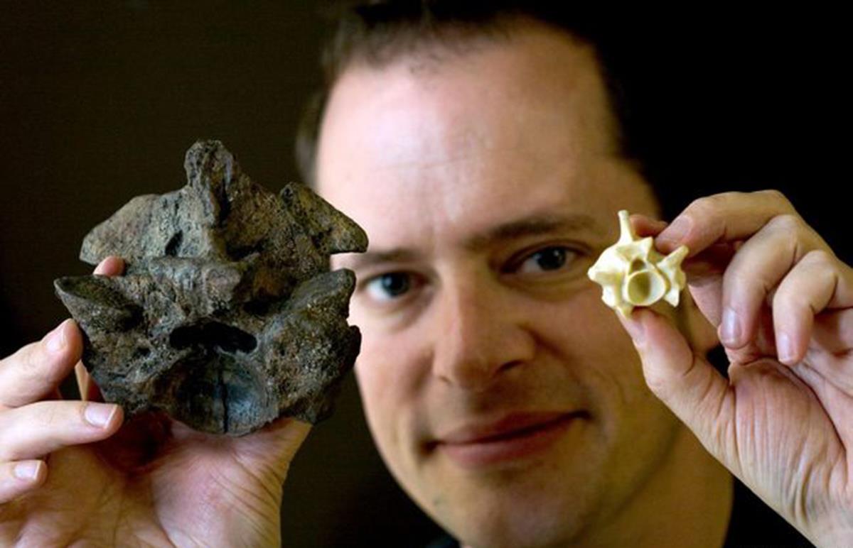 他把化石拿给爬行动物专家杰森伯格进行分析,后者立刻给出答案,这块化石是蛇的脊椎骨,并不是鳄鱼的骨骼。化石与现代蟒蛇的脊椎骨如出一辙,杰森分析史前塞雷洪很有可能生存着一种庞大的蛇类。