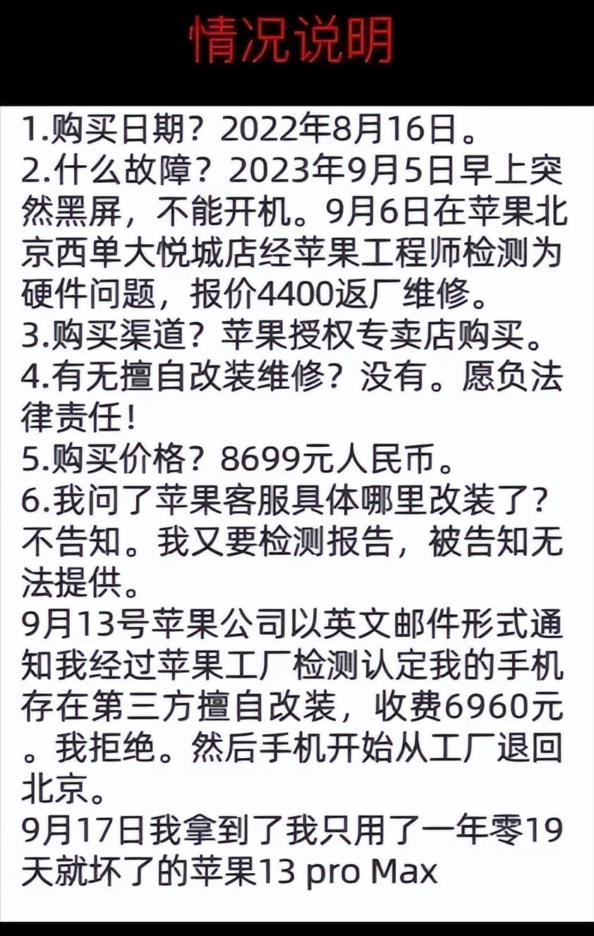 刘金在视频中表示,他一年前购买的苹果手机出现了黑屏问题。经过官方检测,手机主板出现了问题,维修费用高达4400元。尽管刘金坚称手机仍在保修期内,但苹果方面回应称手机已被私自改装,维修费用需要高达6960元。这一答复让刘金感到非常不满,他觉得自己受到了侮辱,因此决定在公众面前砸掉手机,表达自己的不满。