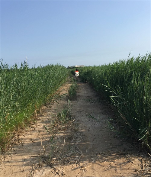 本来走到一半左右的时候,闺女就想打道回府了,觉得太累、太远,而且阳光很大。但在我一步一步诱惑下,跟着我们继续前行。但其实,在微风吹拂下,偶尔有点树影,感觉还是很凉爽的。但因绕的太多了,确实有点远了,所以我们就想走捷径,边走边找,看是否有小道从芦苇荡中穿插过去。还真幸运,真找到了一条芦苇荡中的小道,否则要绕到下图房子那里去了:(