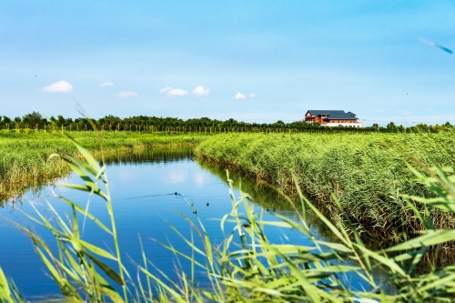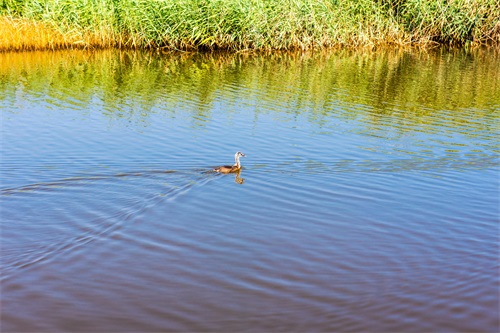 湖中的芦苇荡,有很多野鸭和鸟类,远处的观景台和凉亭 /摄影:吾设吾影