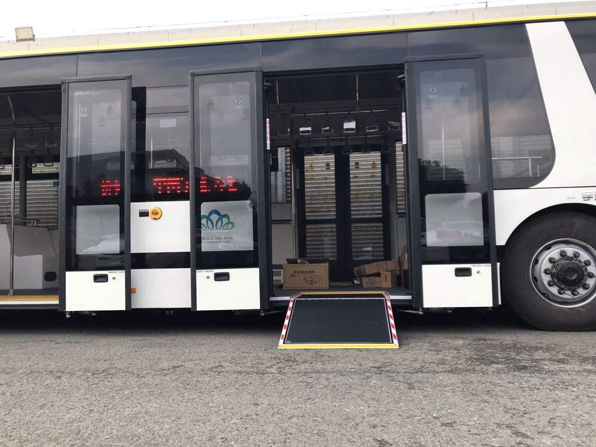 比如防止车辆排出的热气影响到乘客的乘车体验,摆渡车车身两侧各设有一个排气口,与两侧的车门联动,会自动切换排放系统位置。低底盘低地板的设计专门为行动不便的乘客所考虑,独具匠心的空气悬挂与斜面踏板方便每一位乘客上车,