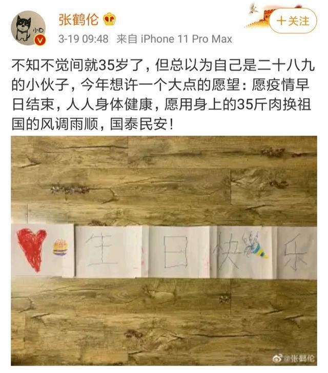 张鹤伦在社交平台晒出一张照片,一看就是孩子的字,应该是小白的儿子送给他的生日礼物,写着生日寄语。小白感慨时光飞逝,许下祖国风调雨顺,国泰民安的生日愿望。