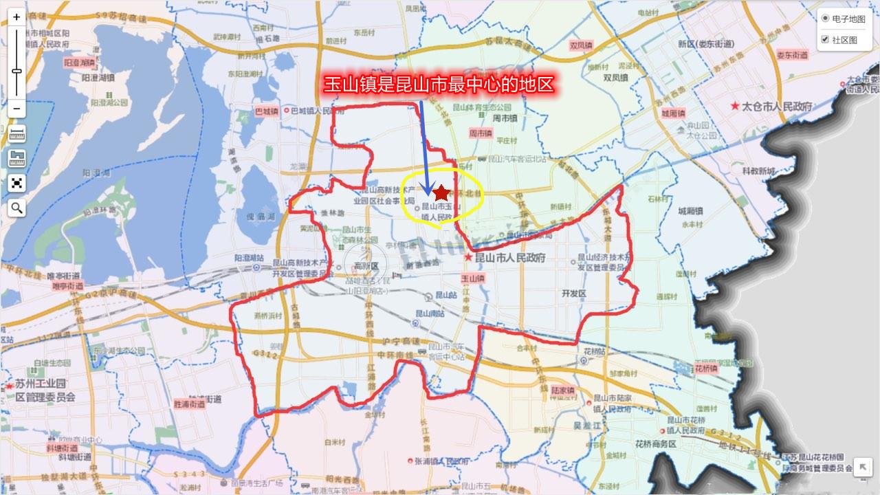 玉山镇在昆山市的位置,它也是昆山市的主城区