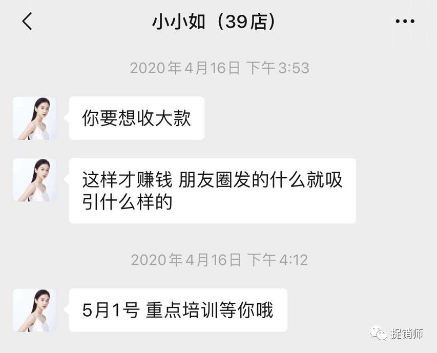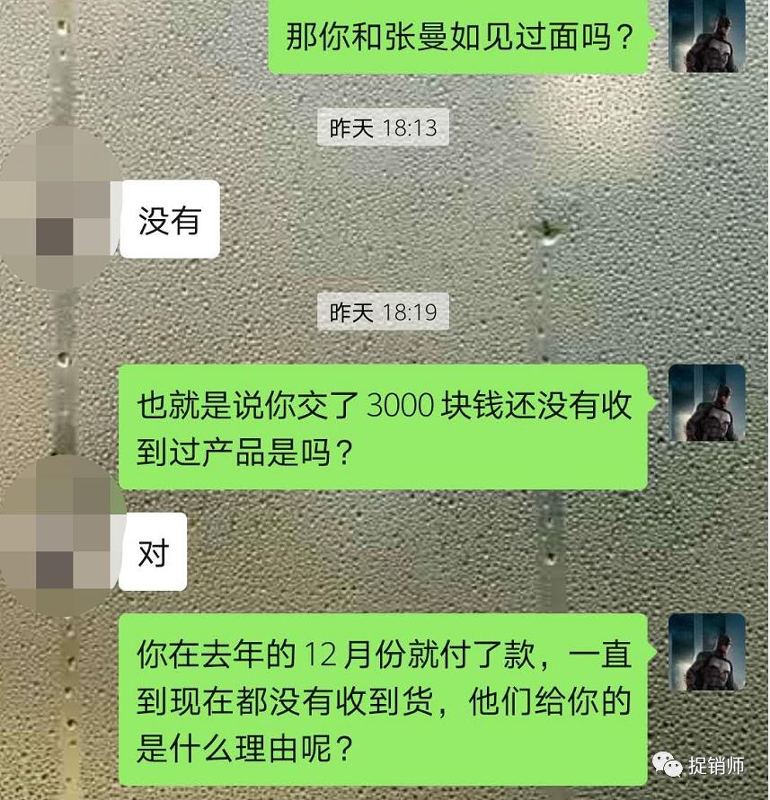 张曼如称,打造朋友圈说款越大越好收钱,越多越好。这样才能吸引更多的人购买产品或如代理,可是骗别人却骗不了我自己,加上5月发现朋友用了产品说痒,起疙瘩,痘痘。心存善念的杨女士想退出,期间一直找张曼如寻求退款,得到的回应是公司规定不支持退款,甚至声称是杨女士个人原因。
