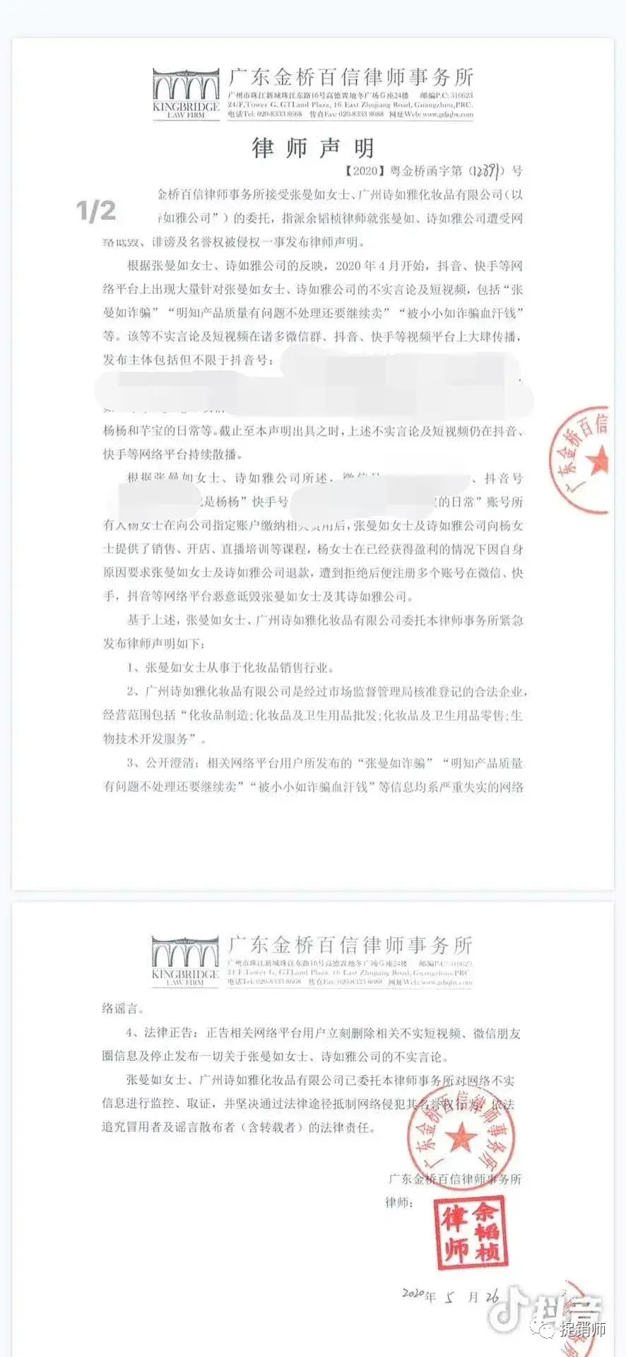 律师函中写道:2020年4月开始,抖音、快手等网络平台上出现大量针对张曼如女士、诗如雅公司的不实言论以及短视频,包括“张曼如诈骗”......发布主体包括但不限于抖音号......