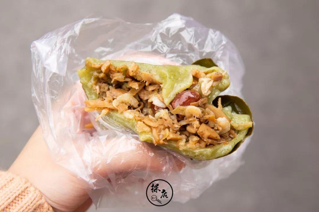 外表像青团一样,阿姨说鼠粬草的营养价值很高,里面包着笋干花生馅,搭配在一起炒鸡好吃,吃完了立马又买了一个嘿嘿。