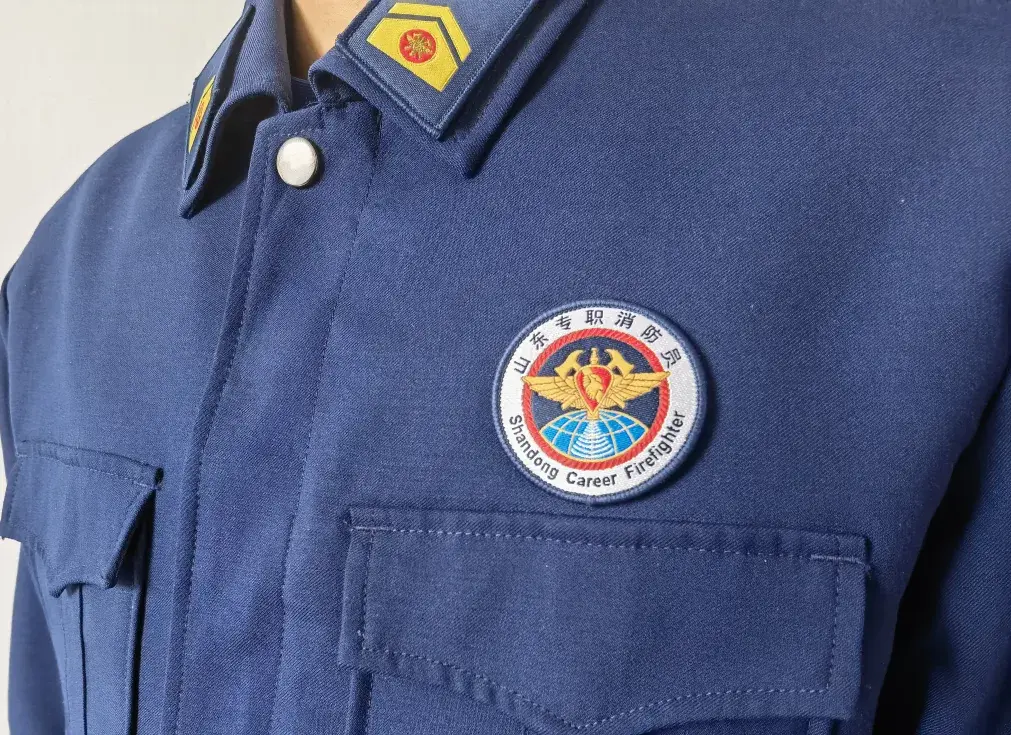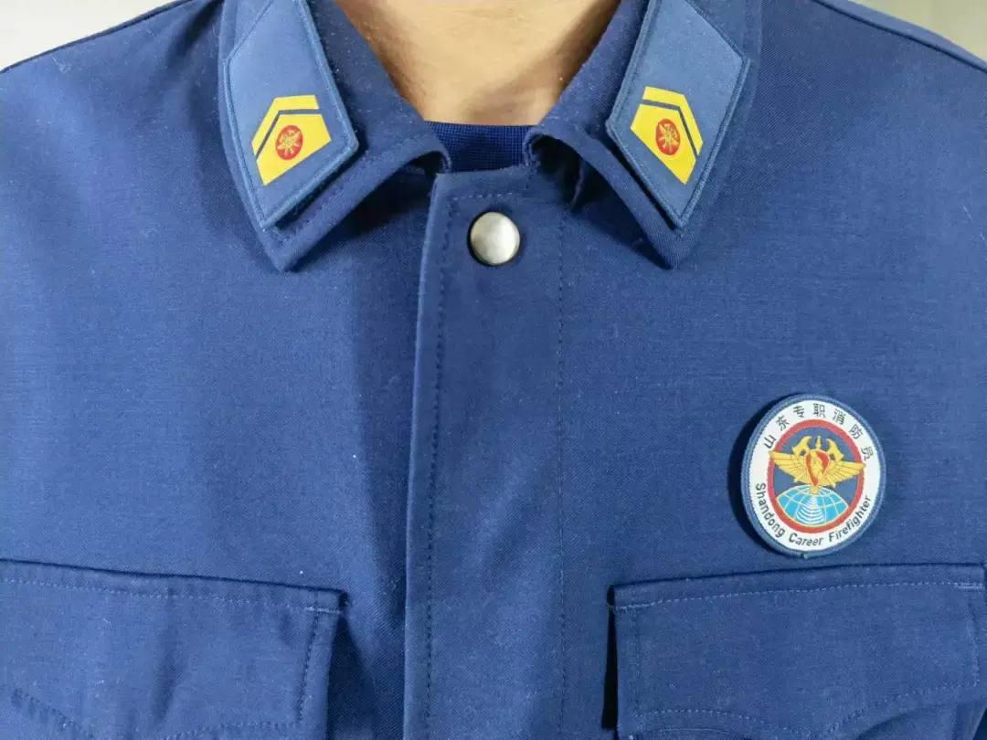 政府专职消防员长袖体能训练服、短袖体能训练服、圆领作训衫、绒衣裤、绒背心等服装,缝制软胸徽(不标明省级行政单位名称,采用通用标志)。