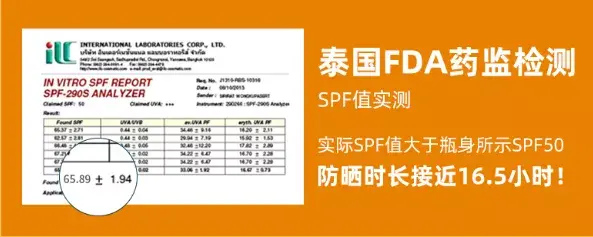 防晒指数严格经过泰国FDA药监检测,防晒时长接近16.5小时。