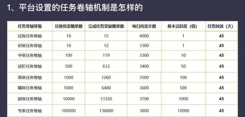比如,你用走路换来的10个糖果,兑换一个初级卷轴。在规定的45天内,只要你每天走满3300步,平台会给你12个糖果、1个活跃度。