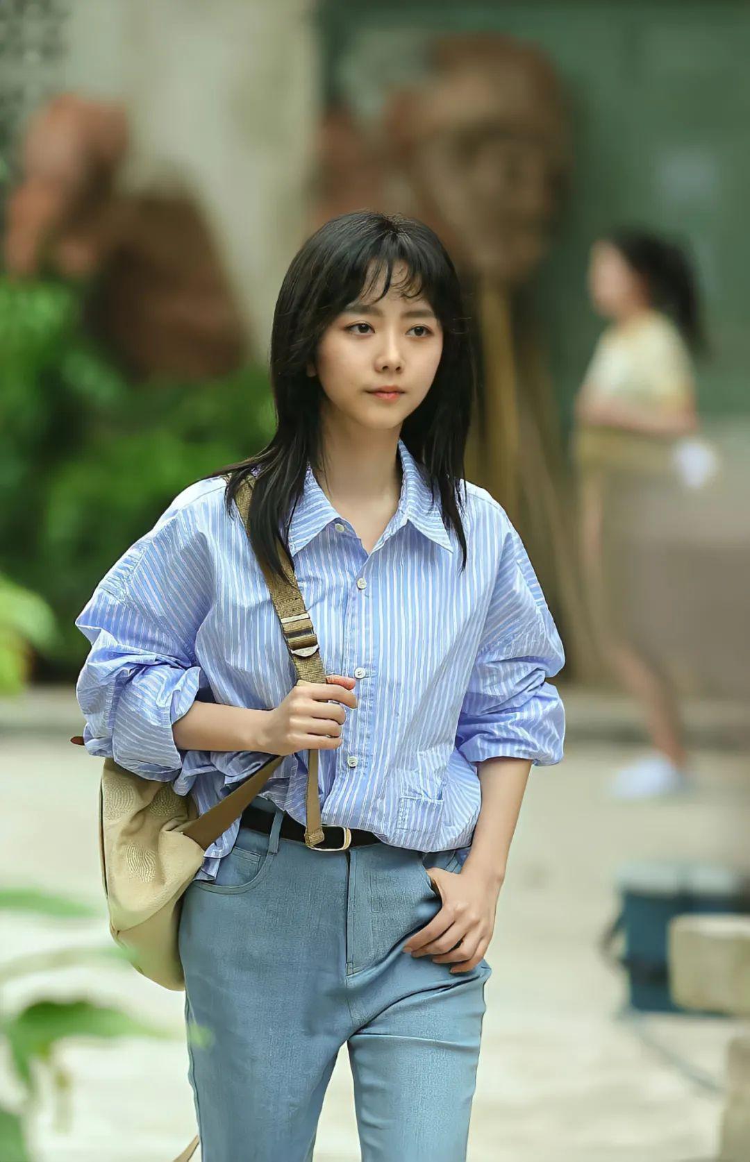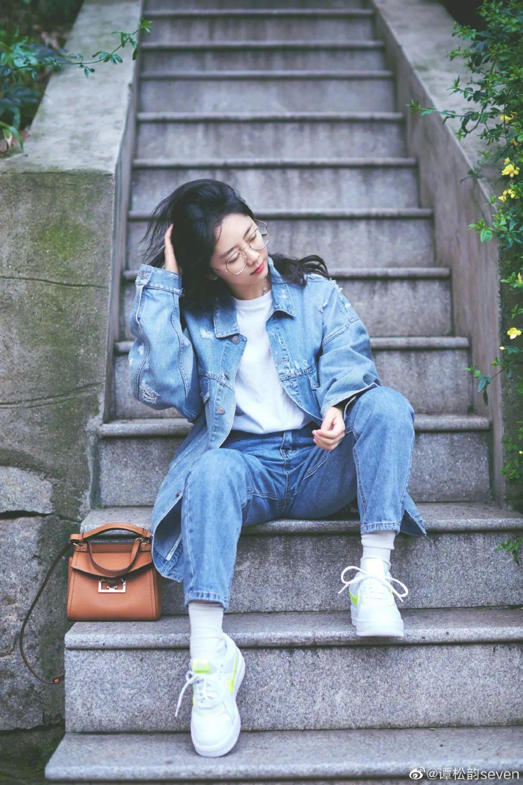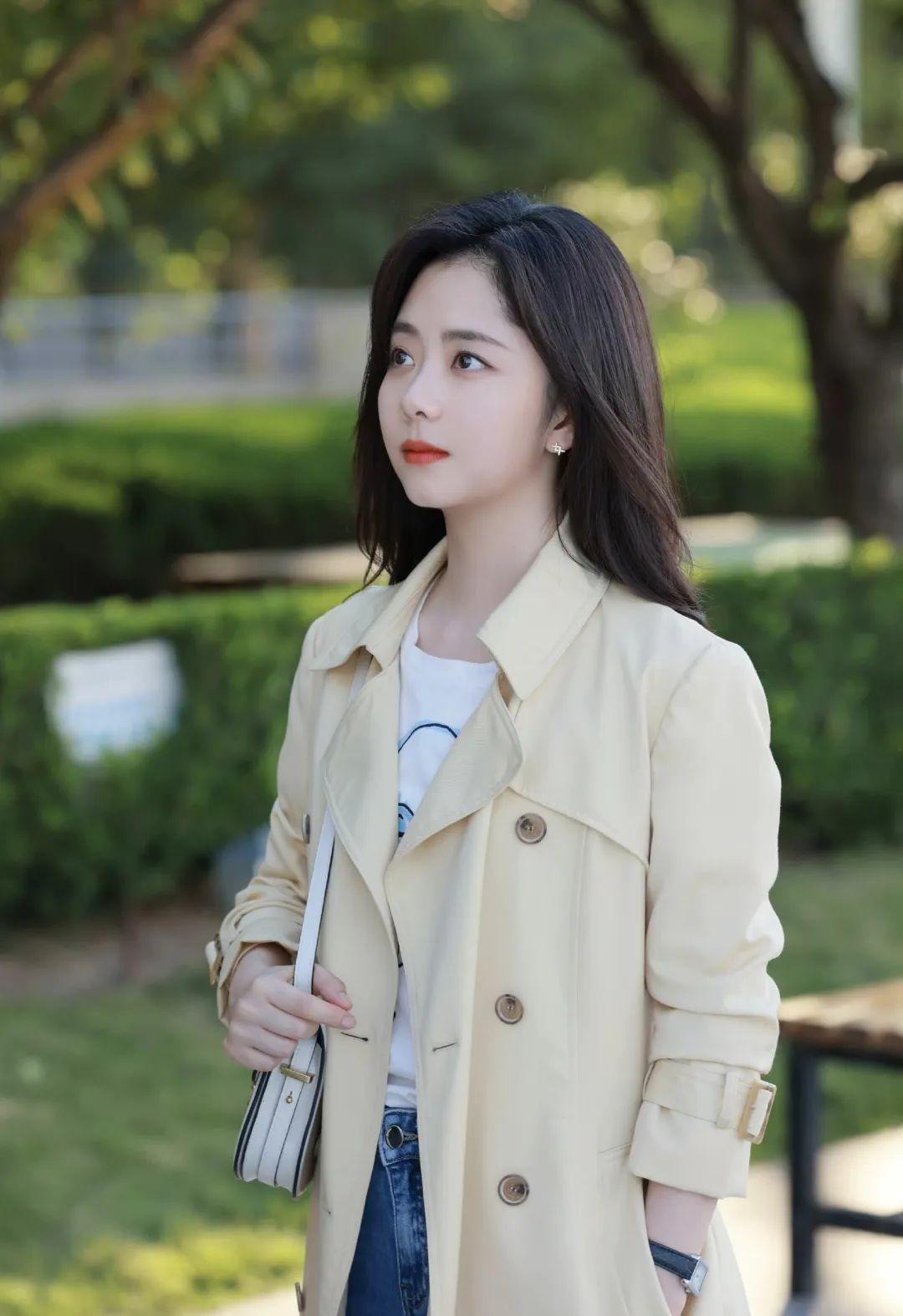 比没什么记忆点的常用色(黑白灰)更好看,和牛仔裤、打底衫等基础款搭配,也更能衬托出她柔和清新的气质~