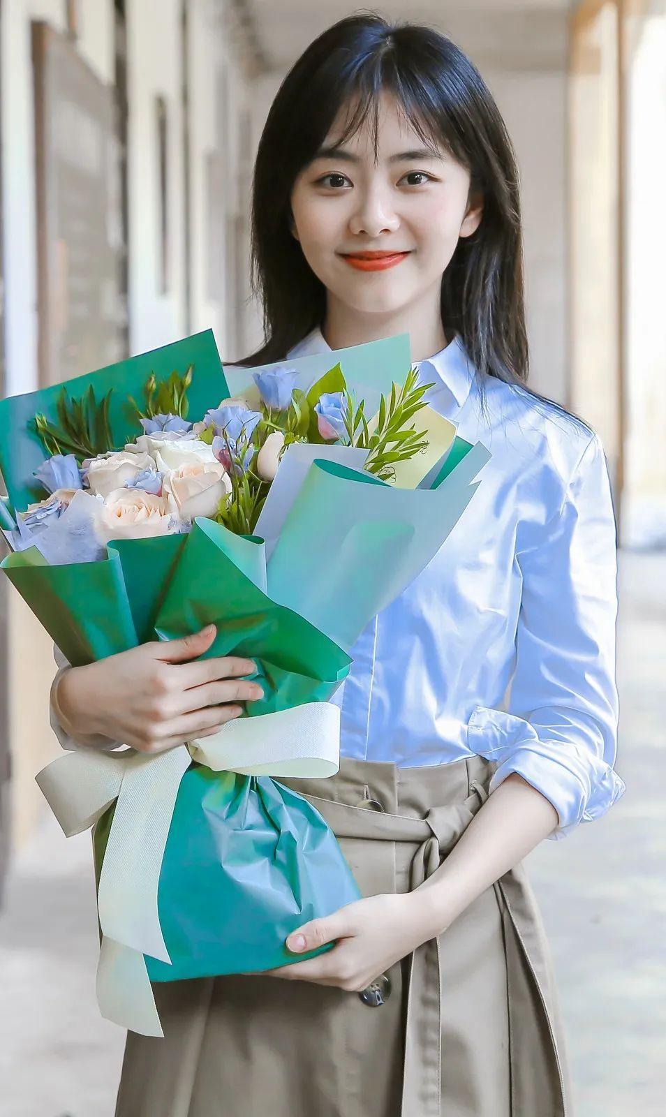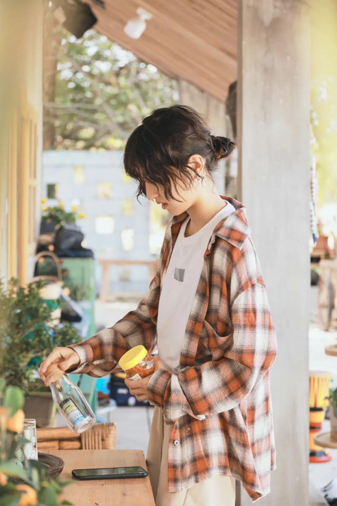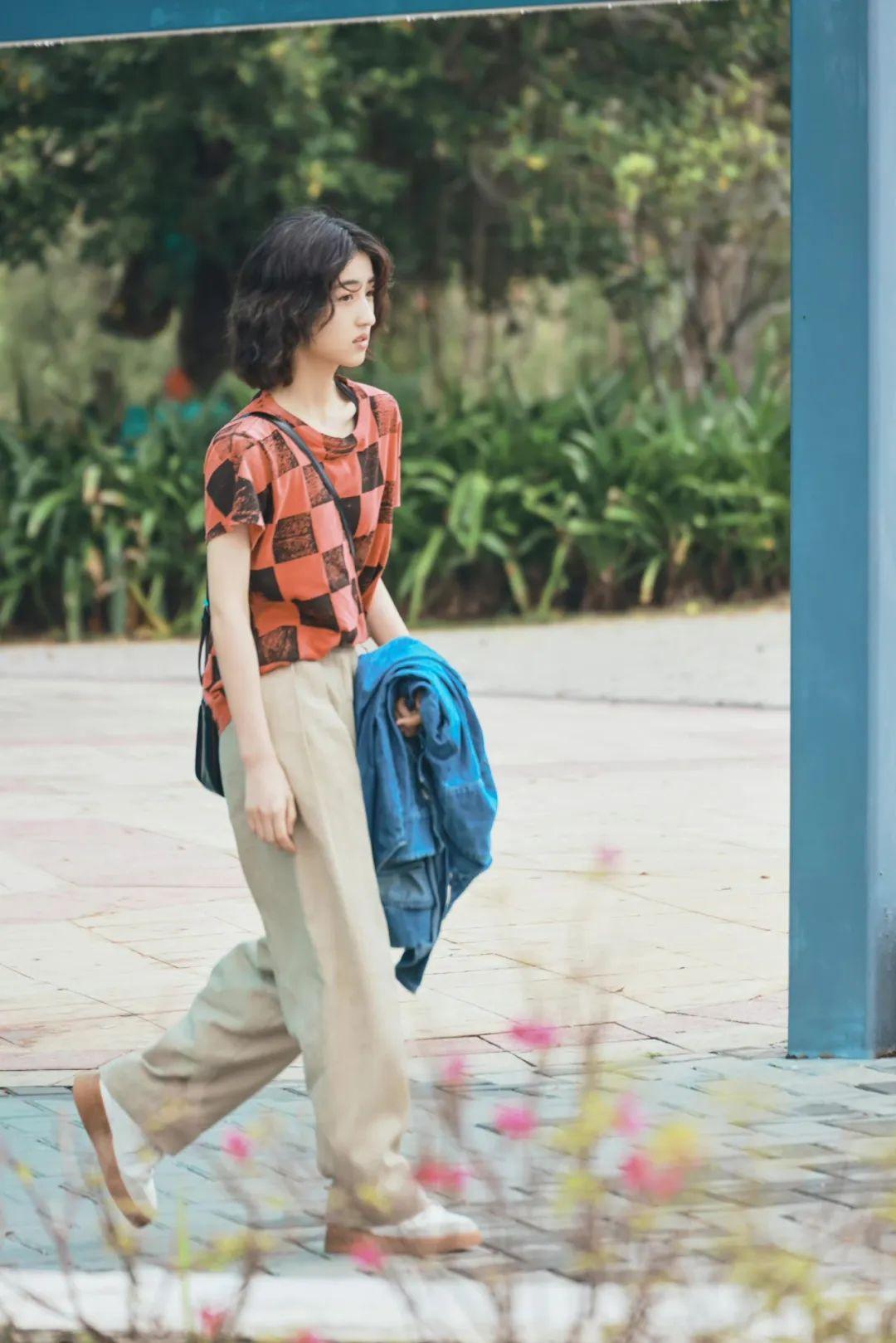 比没什么记忆点的常用色(黑白灰)更好看,和牛仔裤、打底衫等基础款搭配,也更能衬托出她柔和清新的气质~