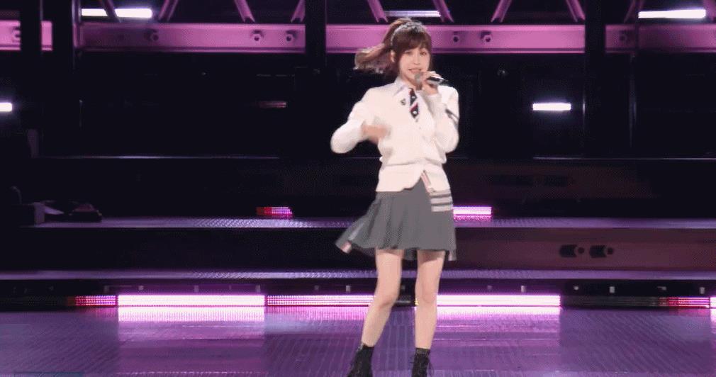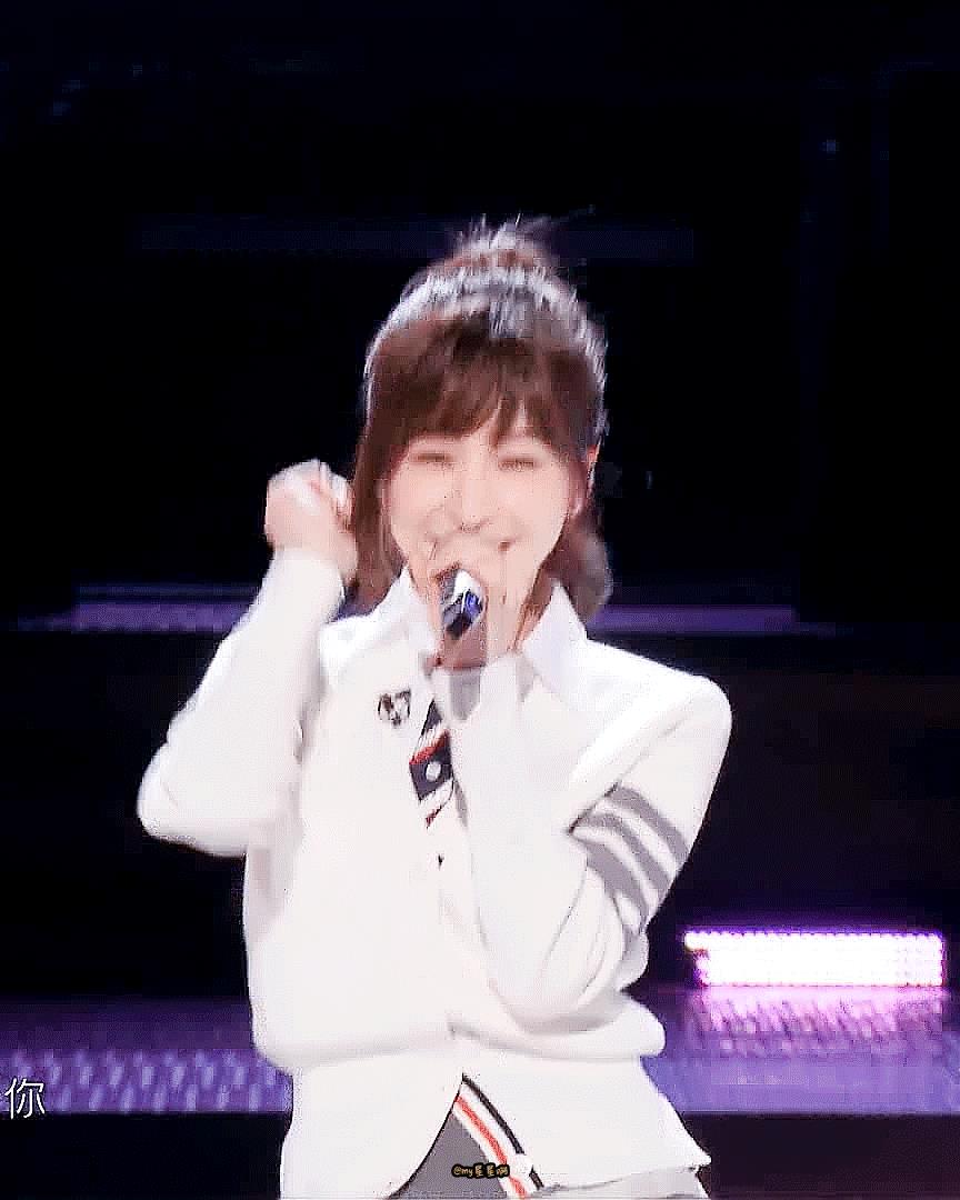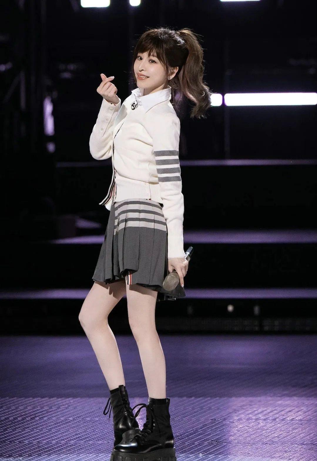 白衬衫、百褶裙、厚底鞋,一整个校园少女风,搭配教主甜甜的笑容,真是满满的青春气息!(时光都好像在教主身上停驻了)