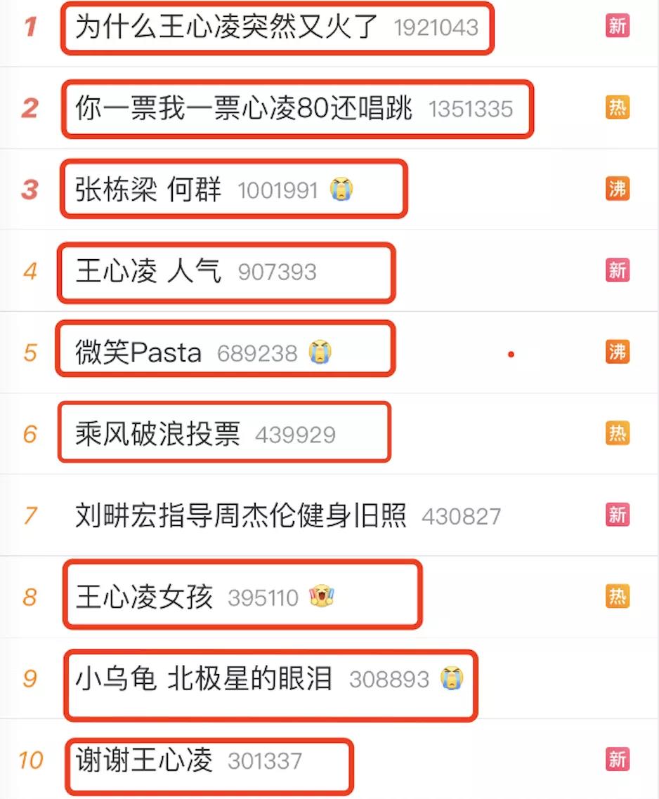 要说里面最让我印象深的,那非我们甜心教主——王心凌莫属啊,热搜前十名几乎全都与她相关!