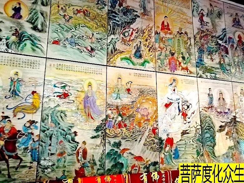 殿宇的东西墙壁画满了菩萨普渡众生的壁画,画工精湛,栩栩如生,仿佛就发生在眼前,配上解说的文字,使人流连忘返,沉醉其中。