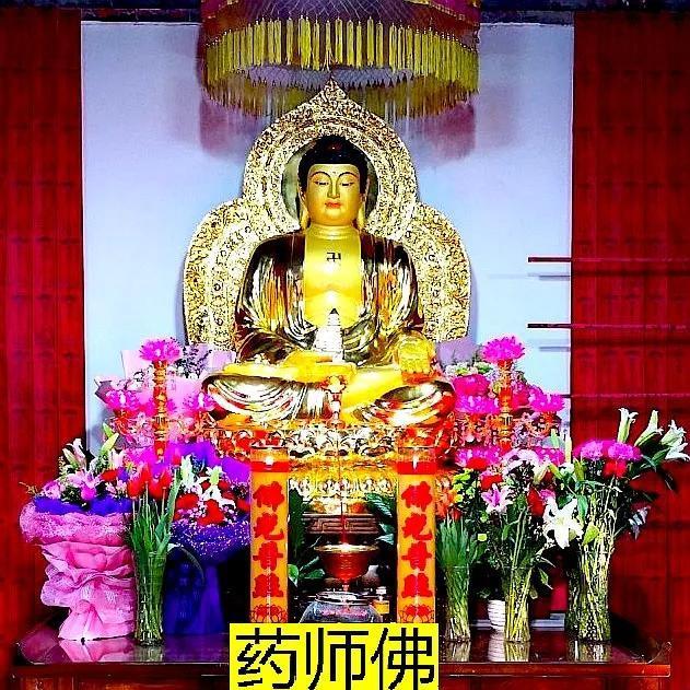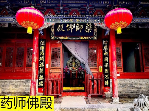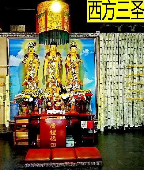 大悲殿两侧有配殿,右侧是药师佛殿,内供药师佛一尊,佛像背后贴满了祈福牌位。左侧是西归堂,内供西方三圣法相,墙壁贴满了往生的牌位。