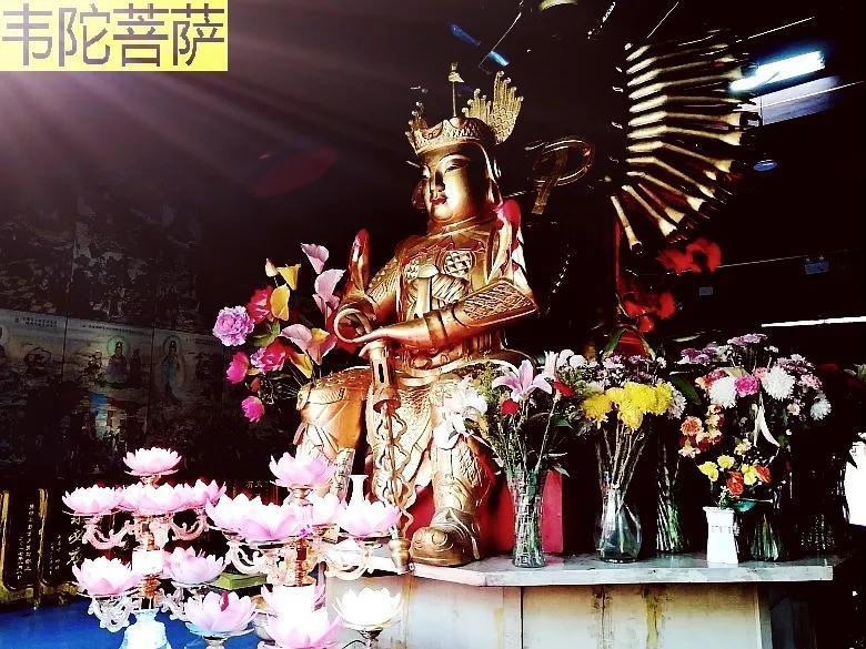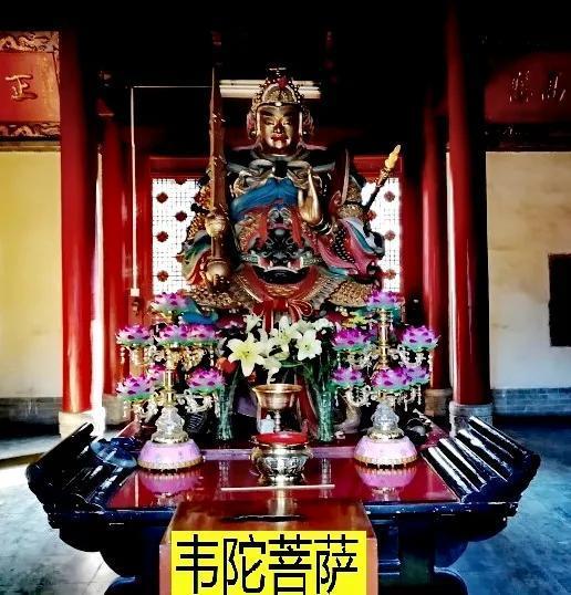 殿内供奉韦陀菩萨,伟岸的将军身,头戴兜鍪盔,身着黄金铠甲,腰系虎头带,右手托降魔金刚杵指向天际,俊朗的童子貌,神情威严,端坐宝座上。菩萨周身散发着大威神力,威震三洲,护佑万国。