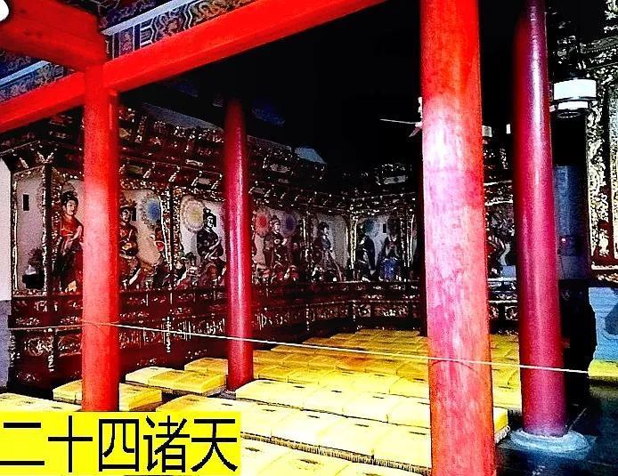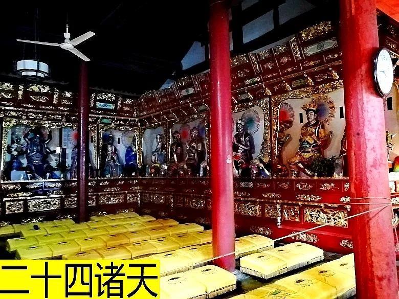 与众不同处,两厢供奉的不是十八罗汉,而是二十四诸天护法神。分别是:大梵天、帝释天、多闻天王、持国天王、增长天王、广目天王、金刚密迹、大自在天、散脂大将、大辩才天、大功德天、韦驮天神、坚牢地神、菩提树神、鬼子母、摩利支天、日宫天子、月宫天子、娑竭龙王、阎摩罗王、紧那罗、紫微星宫、泰山府君、雷神。