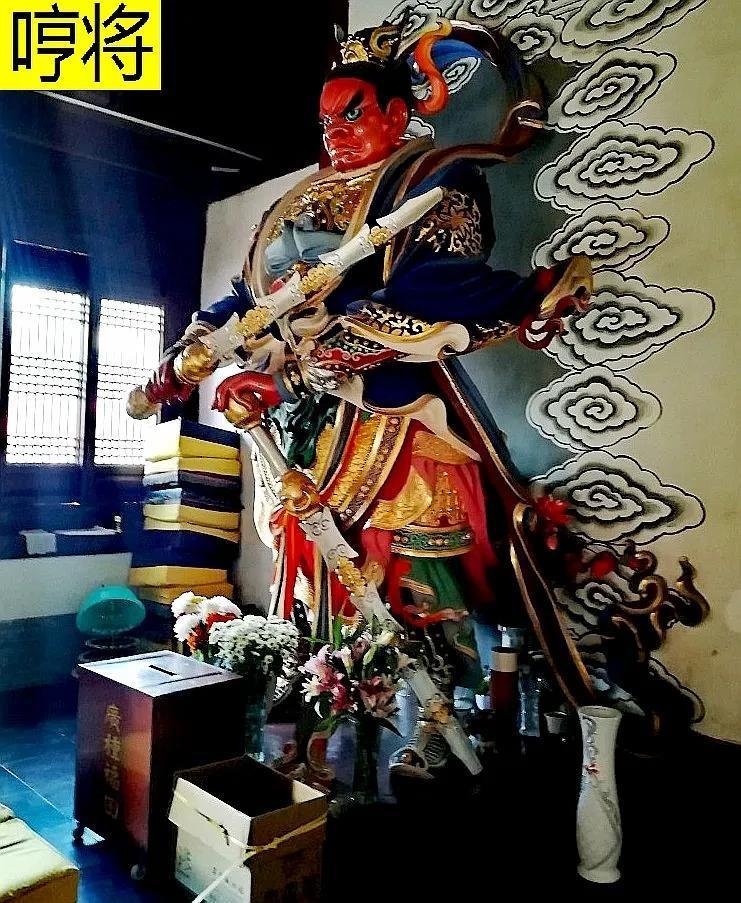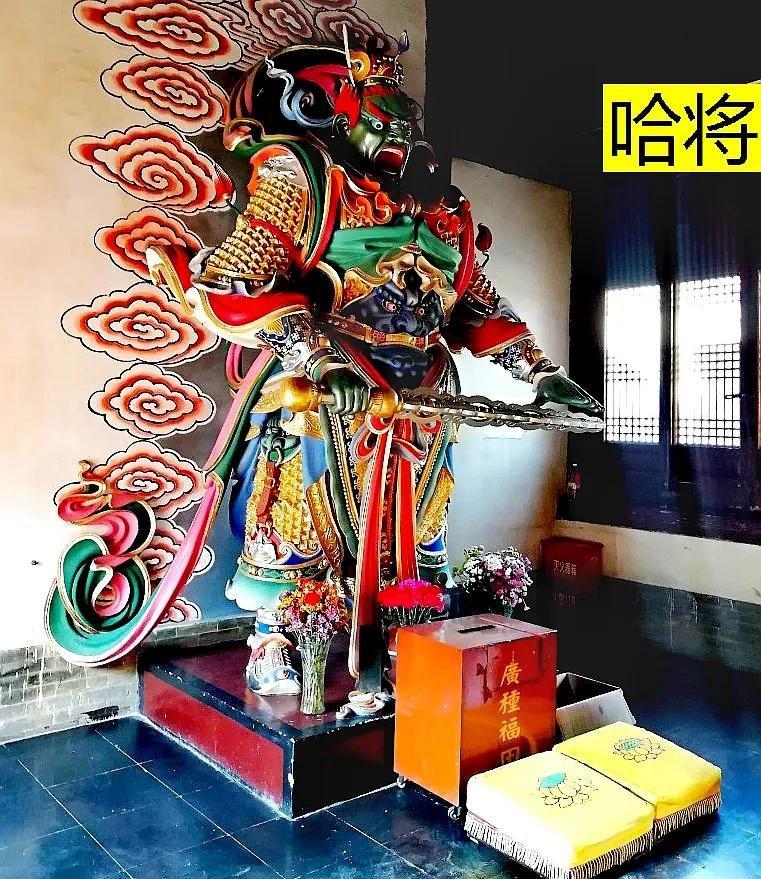 左右两侧是护法金刚,俗称哼哈二将。右侧哼将手持双杵,剑眉倒立,怒目圆睁,威武的气魄使人畏惧;左侧哈将身着盔甲,气吞山河,光这气势就能震慑邪魔歪道,何需用法力。