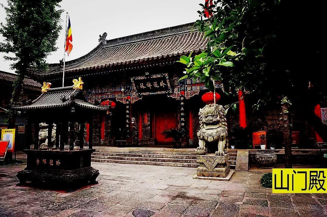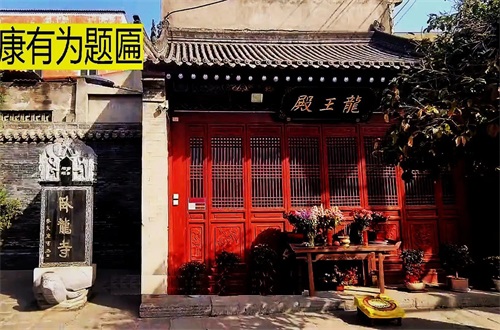 山门殿前的空地不大,左侧是请香处(卧龙寺免门票)。右侧有一座殿,内供龙王爷,龙王也是佛教护法。殿旁边有一石碑,上刻“卧龙寺”,这是康有为来参拜寺院时,亲笔题写的匾额,后来立碑保留。