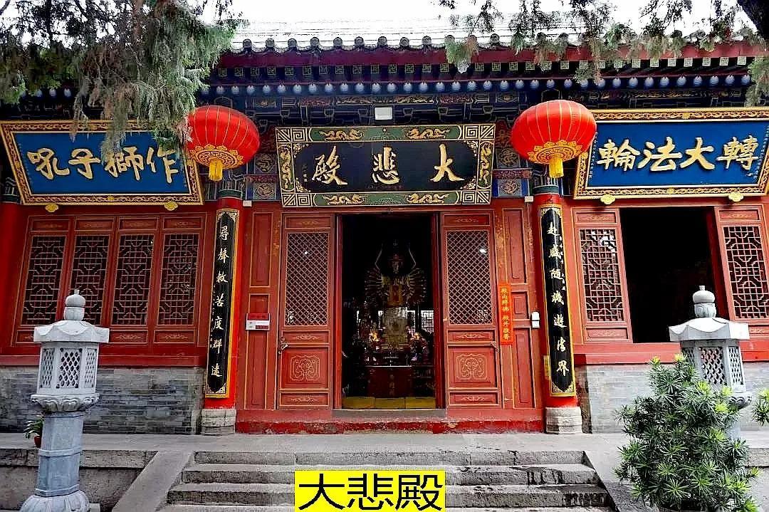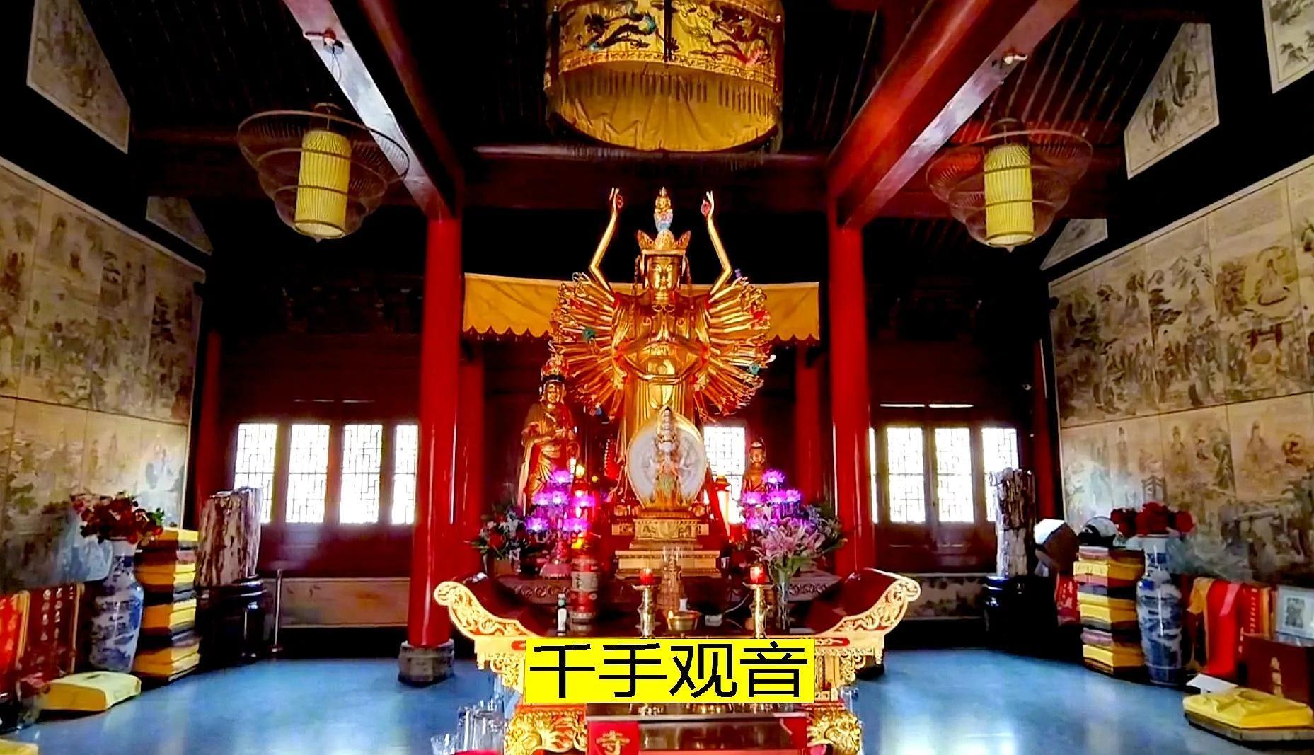 大雄宝殿后是大悲殿,主轴线上的第四座殿宇。内供千手千眼观世音菩萨,法相庄严恢弘,能感到菩萨救渡的神力。左右两侧有胁侍善财童子和龙女。菩萨的背后是韦陀护法的坐像。