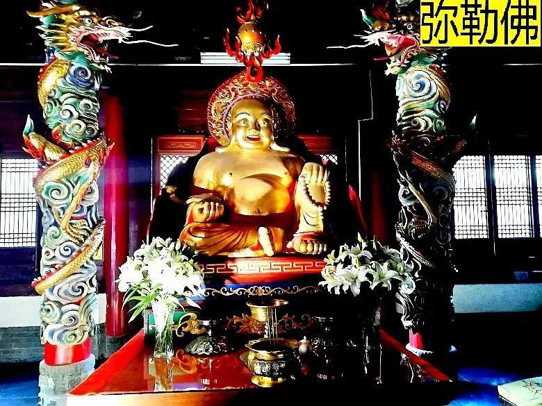 山门殿内居中供奉弥勒佛,布袋和尚的造像,金身法相,半跏趺坐于宝座上,左手持念珠放于膝上,右手可不是拿的乾坤袋,而是如意,笑口常开,万事如意,寓意吉祥。