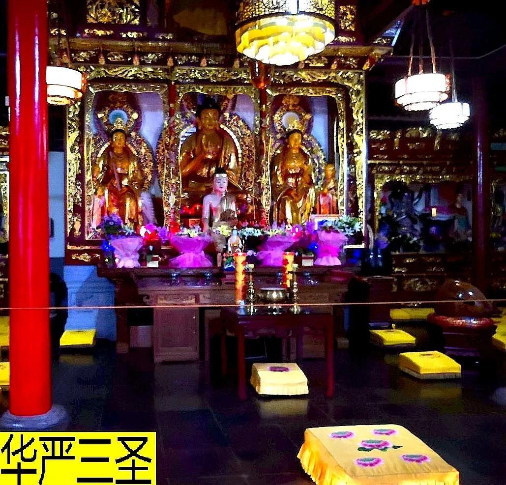 大雄宝殿内高大精美的佛龛内,供奉着华严三圣。居中为释迦牟尼佛,手结佛印,结跏趺坐于莲花宝座;右侧是文殊菩萨,手持如意;左侧是普贤菩萨,骑着六牙白象。三尊佛像珠光玉润,法相庄严。