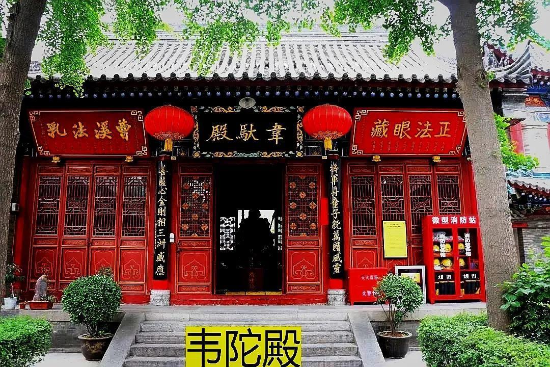 天王殿的背后是韦陀殿,上悬三块匾,中间是殿宇匾额,两旁是“曹溪法乳”和“正法眼藏”。曹溪法乳是一个典故,禅宗流传着这样一句话,曹溪法乳,一滴清凉。是说当年听六祖讲法,听众就像饮到乳汁,只要一滴,就给人一种沁人心脾的清凉愉悦之感。而正法眼藏是禅宗用来指所有佛法。朗照宇宙谓眼,包含万有谓藏。相传释迦牟尼佛在灵山法会以正法眼藏付与大弟子迦叶,是为禅宗初祖,是佛教以“心传心”授法的开始。