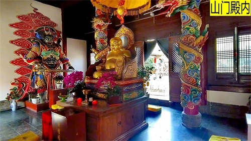 天王殿内迎面供奉伽蓝菩萨——关羽造像。菩萨身着长袍马褂,头戴宝盔,右手持青龙偃月刀,左手施佛礼,赤面赤心忠肝义胆,青灯青史流芳万古,由于一身的凛然正气,被尊为武财神。殿内四周供奉东方持国天王,南方增长天王,西方广目天王和北方多闻天。
