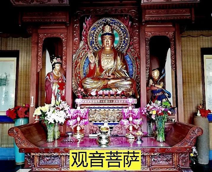 天王殿的右侧是地藏殿,内供地藏王菩萨,两旁有胁侍闵公和道明父子。左侧是观音殿,内供观音菩萨,结跏趺坐于莲花宝座,祥瑞之光射散千门病;右手托净瓶,瓶中甘露能除万国灾;左手持杨柳枝,为众生拂开佛国金世界,放下贪念早皈依。右侧是童子拜观音,左侧是手捧宝珠的龙女。