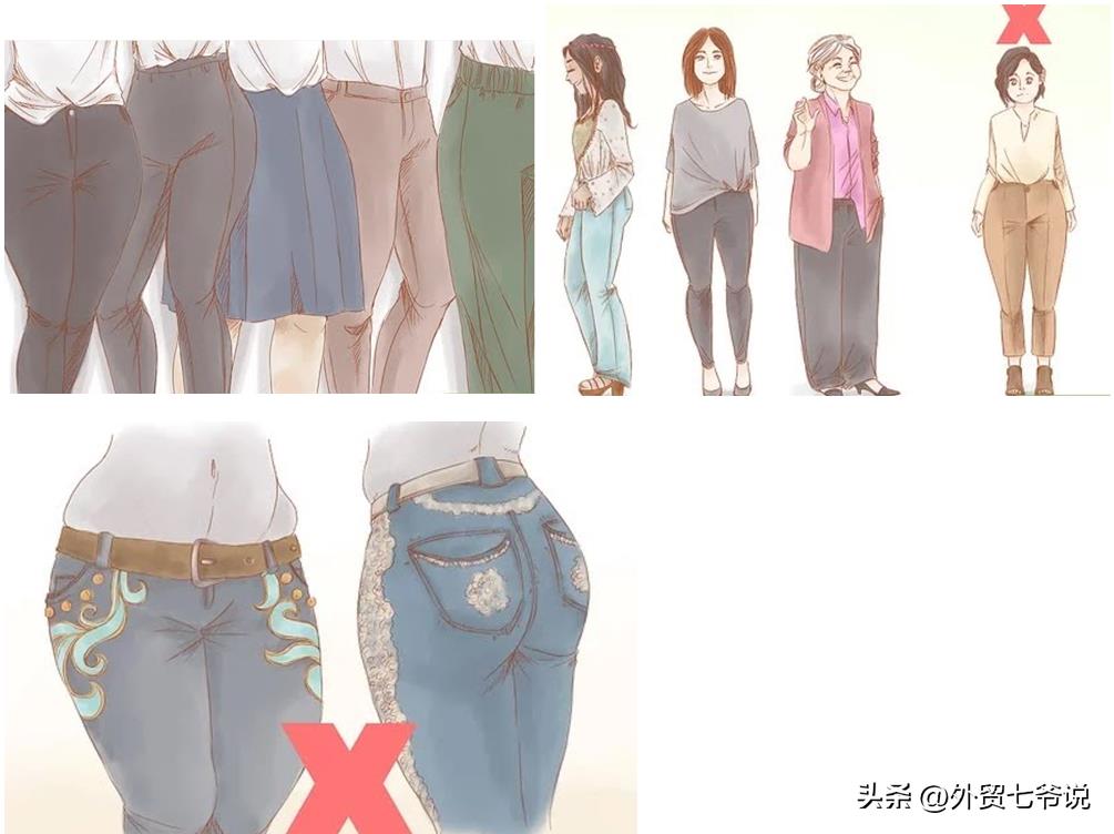 总结:尽量避免紧身裤、避免腰臀部位有过多装饰的裤子