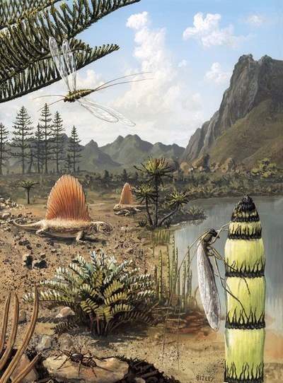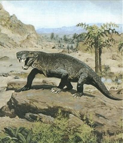 二叠纪时期陆地上的主要动物是两栖动物,爬行动物开始大量繁盛,如杯龙目、盘龙目、兽孔目,它们分别是现代爬行类、鸟类和哺乳动物的先祖(或其近亲)。陆地上也生活着许多大型植食性动物,如麝足兽、始巨鳄、二齿兽、水龙兽,这些动物都属于类哺乳爬行动物。陆地上的顶级捕食者要属丽齿兽,丽齿兽身长约3.5米,体重约300千克,奔跑时速达到100千米,它们的脑容量很大,成群活动。