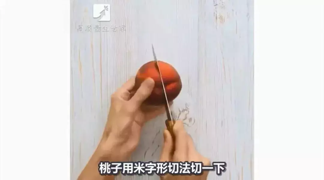 水果刀把桃子米字型切一下。