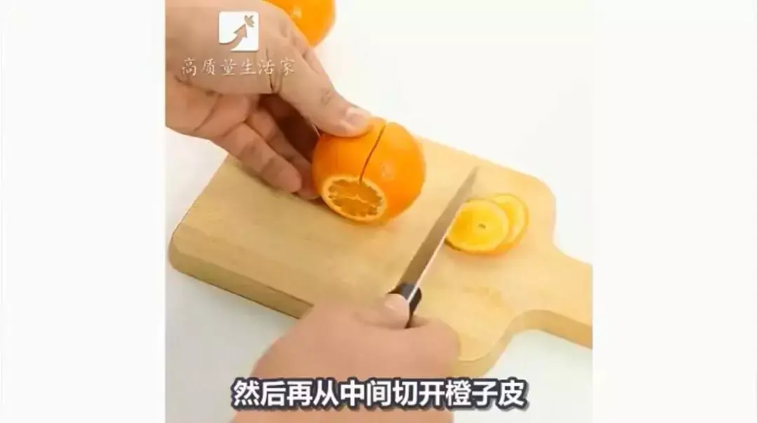 然后再从中间切开橙子皮。