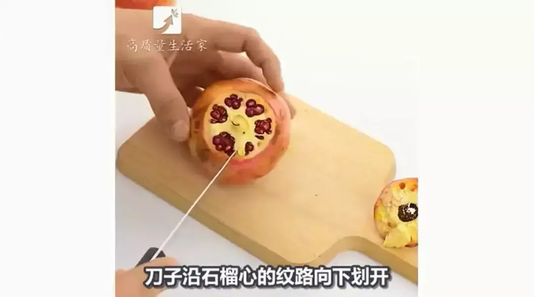 刀子沿石榴心的纹路向下划开。