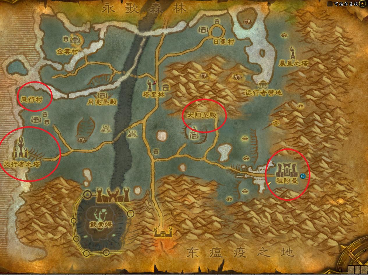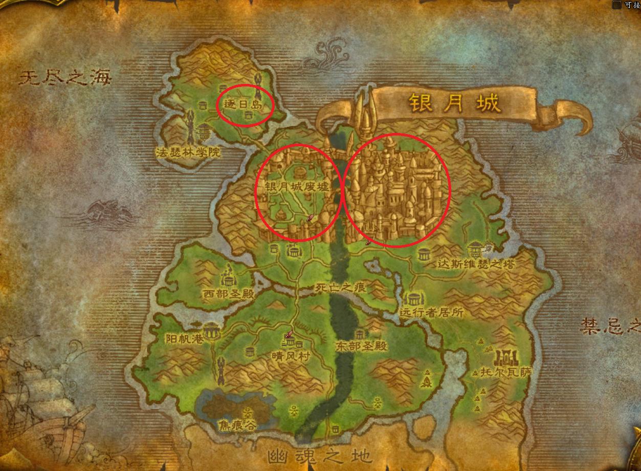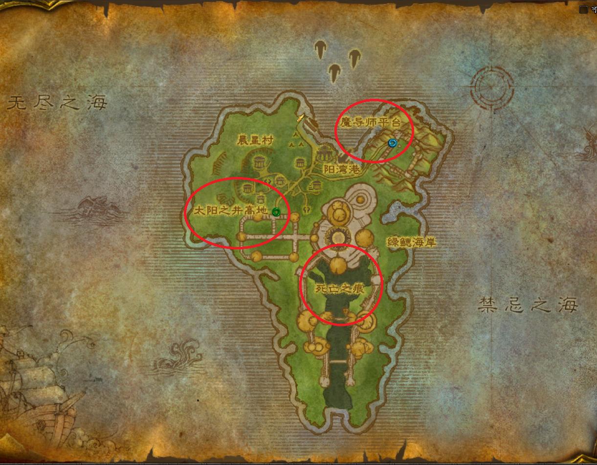 左上角的逐日岛是血精灵小号们的出生地。