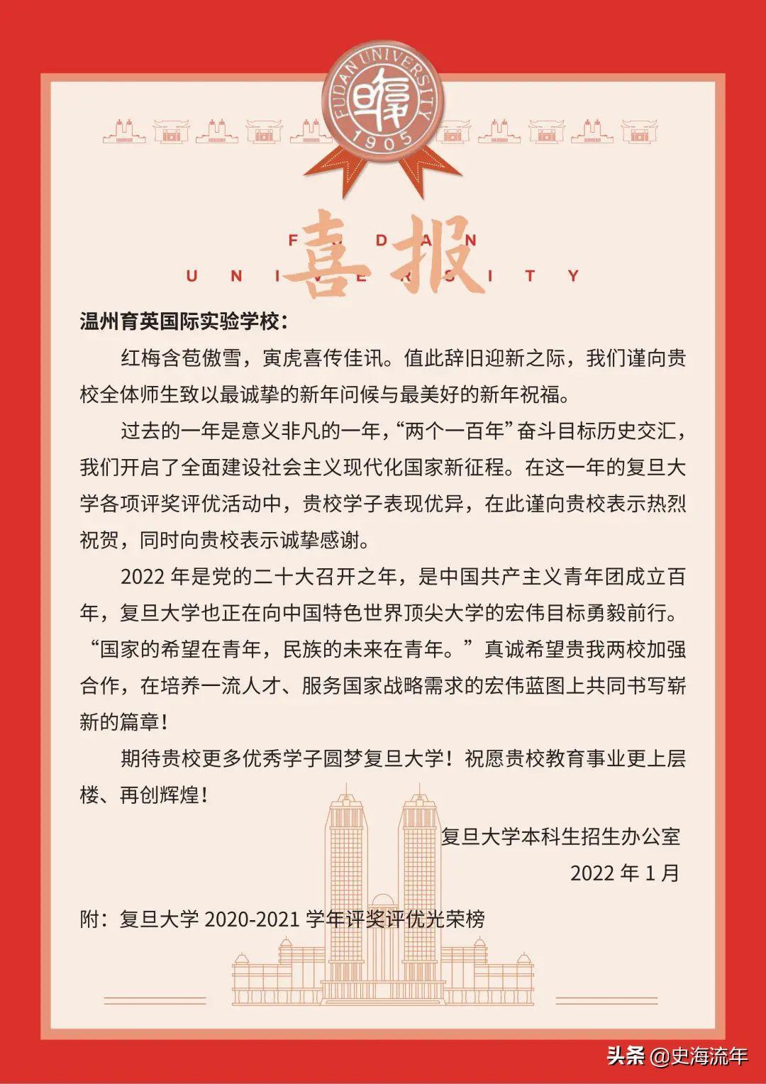 一、复旦大学给温州育英国际实验学校发来的喜报