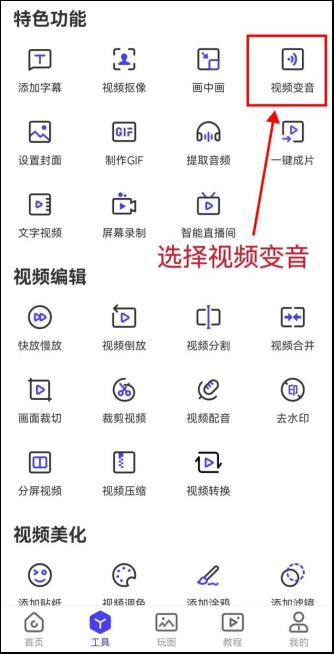 1、打开手机端的清爽视频编辑,在下方的功能栏中选择【工具】这一栏,然后你就会发现这里有好多的特色功能和视频编辑工具。功能十分的强大,视频抠像、提取音频、去除水印等这些功能都是专业的影视后期所需的功能。我们按照需求选择【视频变音】就可以了。