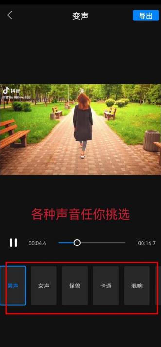 2、进入视频变声界面以后,我们把视频素材导入进入,软件会内置各种变声声音等你挑选。男声、女生、怪兽、卡通等声音素材。确定一种声音后,点击右上方的【导出】就可以了,这样我们就成功把视频进行变音处理了。