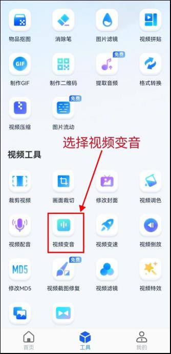 1、打开手机端的书单视频助手软件,打开【工具】一栏,这里不仅有大量的视频处理工具,还有一些消除笔、图片滤镜、物品抠图这些专门处理图片的工具。我们按照要求选择【视频变音】就可以了。