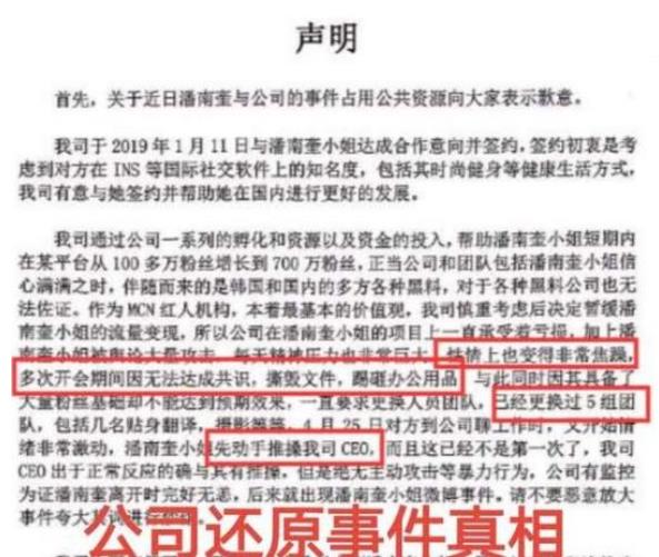 这时经纪公司也坐不住了,很快就贴出声明。对方表示,潘南奎来到中国没多久后就与自己签约了,公司也一直在捧她。