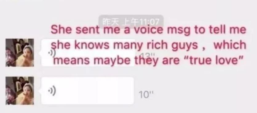 截图中很明显是她与潘南奎的对话,后者不仅炫耀自己和Mandy的老公在一起了,还发语音表示自己认识的富二代很多,但唯独这个是真爱。